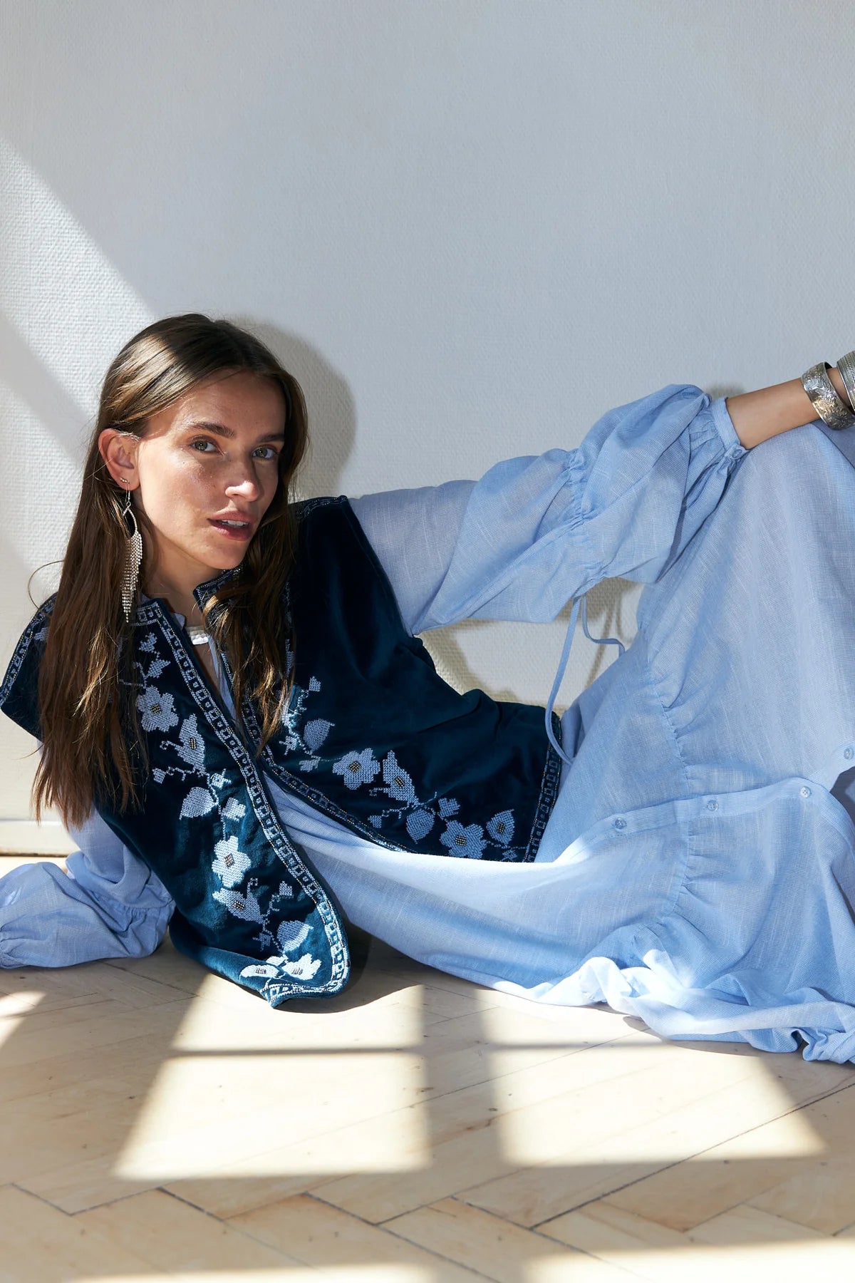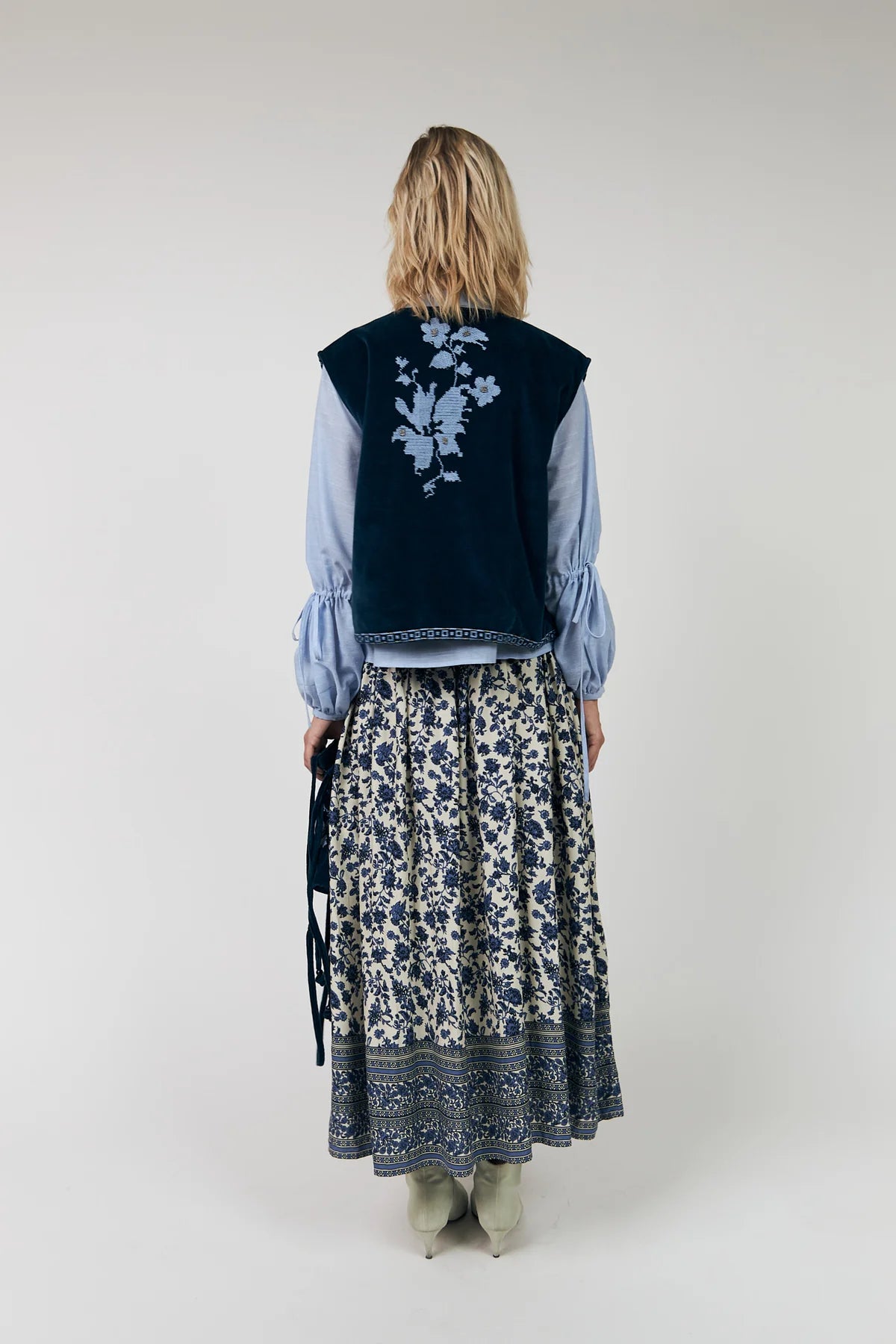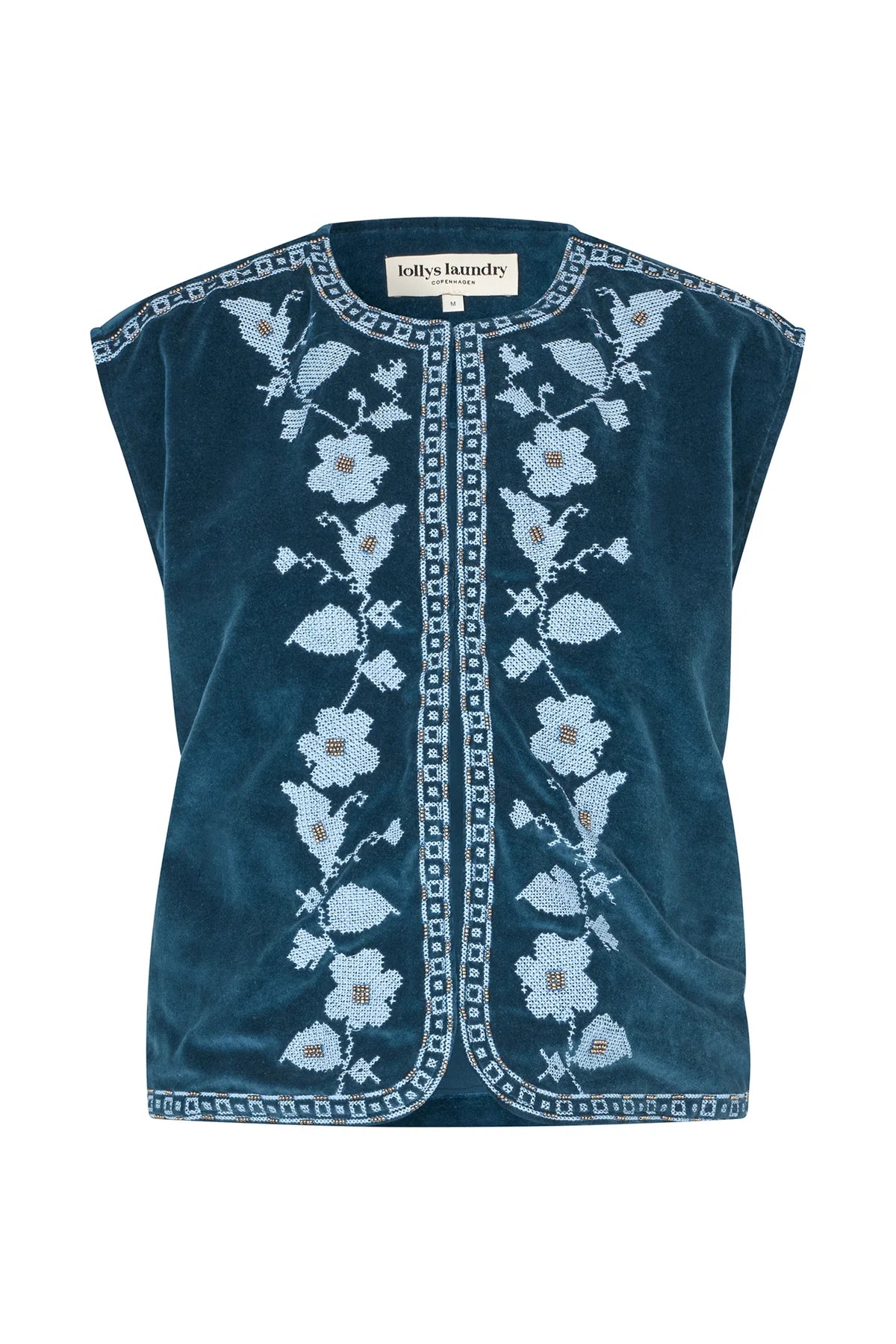 The BinLL vest is a soft velour vest with beautifully artistic embroidery that brings a feminine and handcrafted expression to your look. The silhouette is relaxed with rounded edges that elegantly highlight the embroidery’s delicate details.