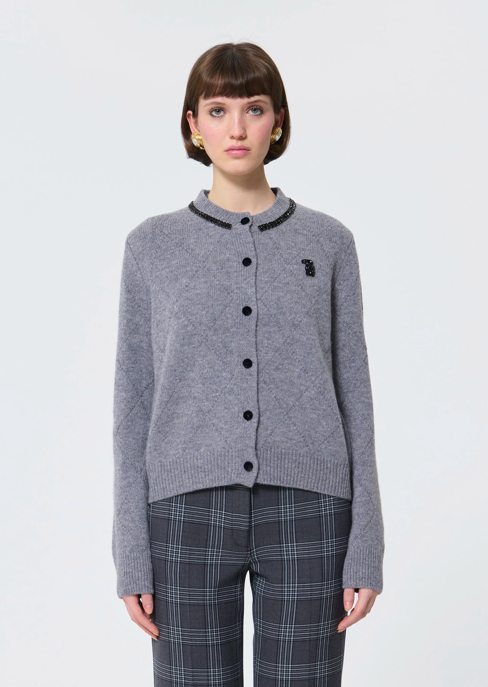 Gael, our heather gray cardigan. Made from carefully selected wool. Every detail counts. Especially the black ones. This Gael heather gray wool cardigan is part of the Betty or Twiggy wardrobe. It pairs perfectly with the Prudie fine sweater and Phillipa trousers.
