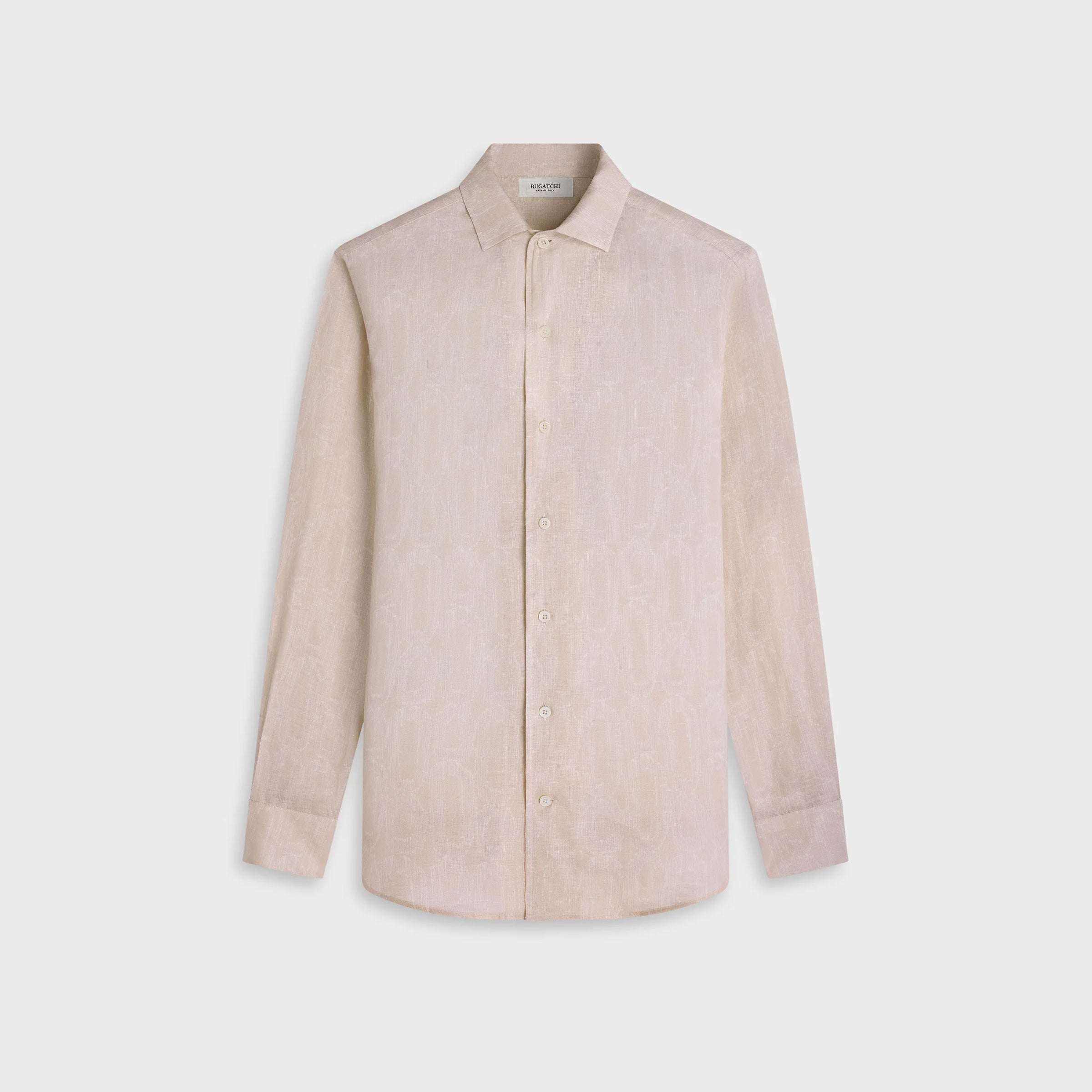 The Alvin long-sleeve shirt is crafted in Italy from 100% Italian linen jacquard in a subtle tonal pattern. The naturally breathable linen fabric offers a soft hand and an elegant drape, embodying effortless sophistication. Finished with a one-piece spread collar, genuine mother-of-pearl buttons, and adjustable notched cuffs. A polished expression of modern tailoring that transitions seamlessly from tucked to untucked.