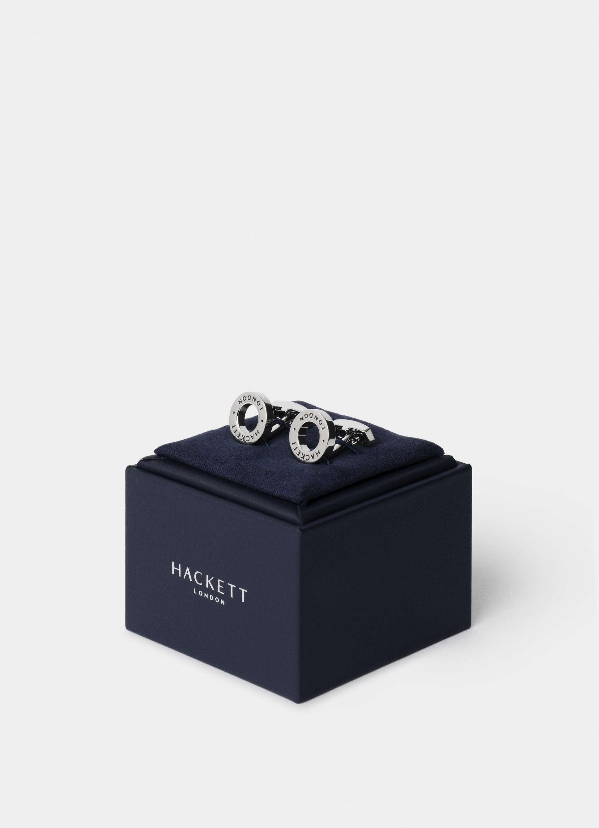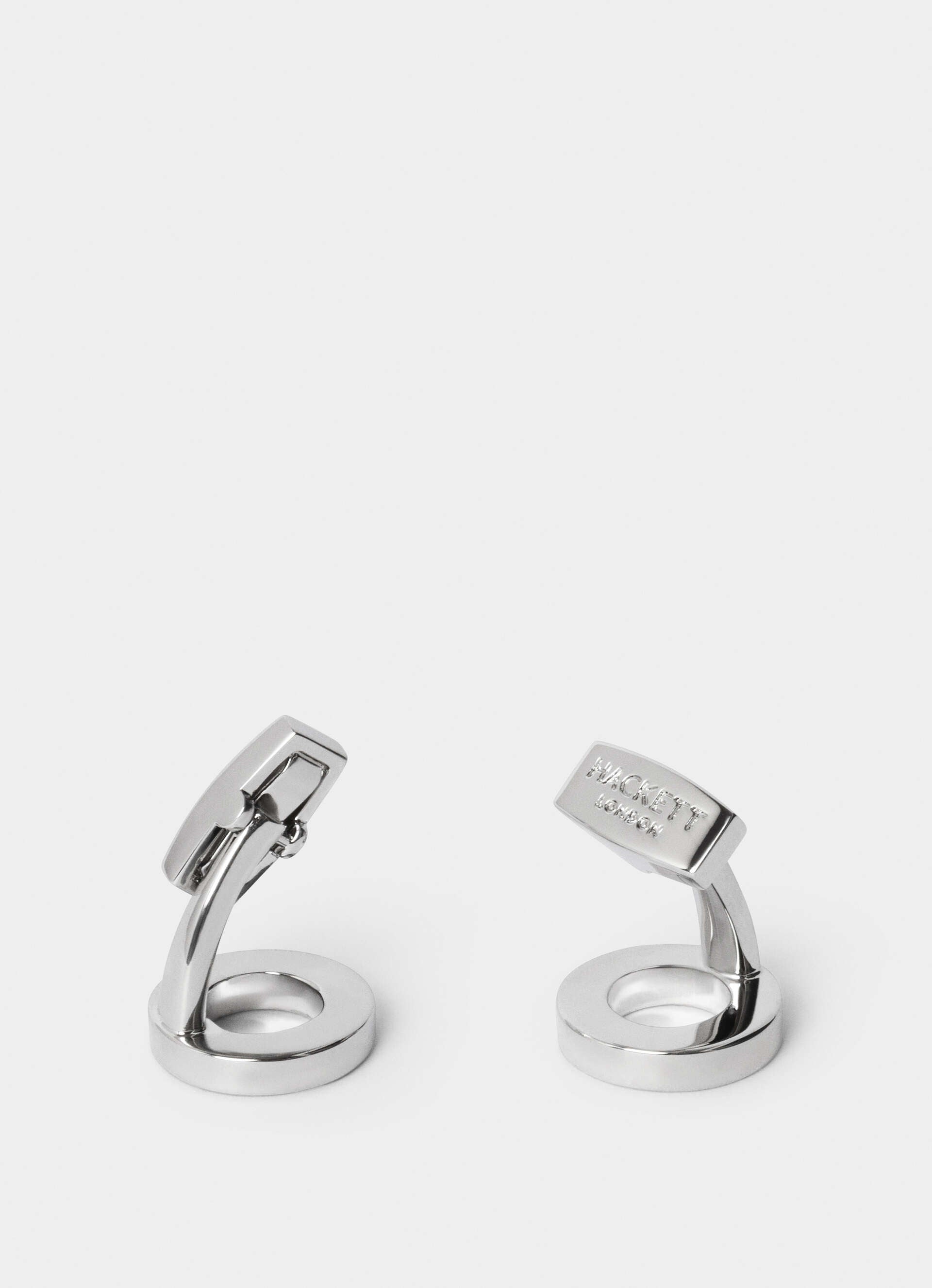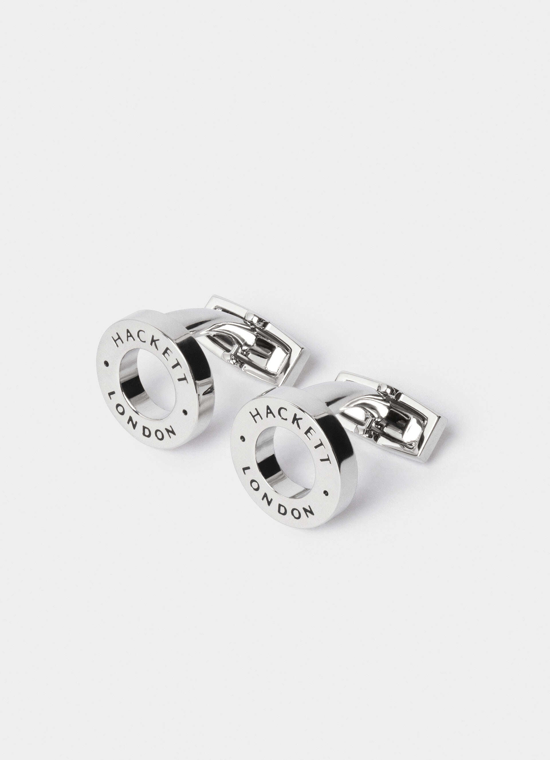 Open circular design cufflinks. The inner and outer edges of the circle are subtly engraved with "Hackett London" branding and small dot accents. The open center of the circle adds a modern touch.