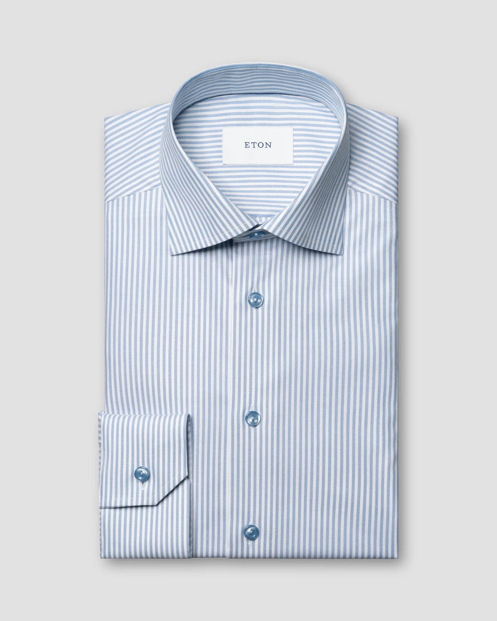 A dress shirt crafted from a soft, breathable blend of cotton and TENCEL™ Lyocell, woven with narrow even stripes for a crisp, understated look. Naturally wrinkle-resistant with a fluid drape and gentle sheen, it’s finished with blue buttons for a clean, elevated finish.