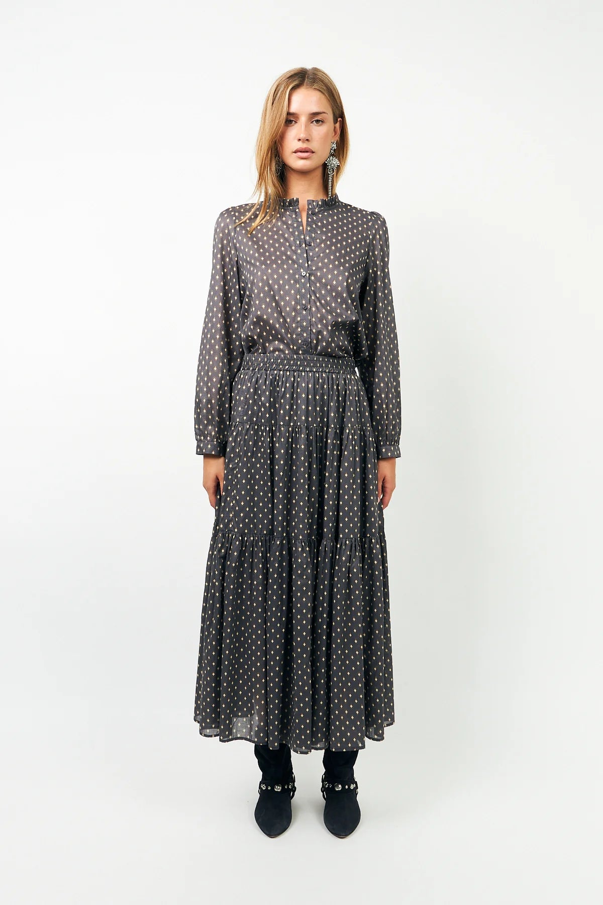 RiverLL is a classic shirt with a timeless print in beautiful, discreet colours. Made from 100% cotton, it offers a soft, comfortable and breathable quality, perfect for both everyday wear and special occasions. The shirt is detailed with a delicate frill at the collar and small pleats at the shoulder for a feminine touch.