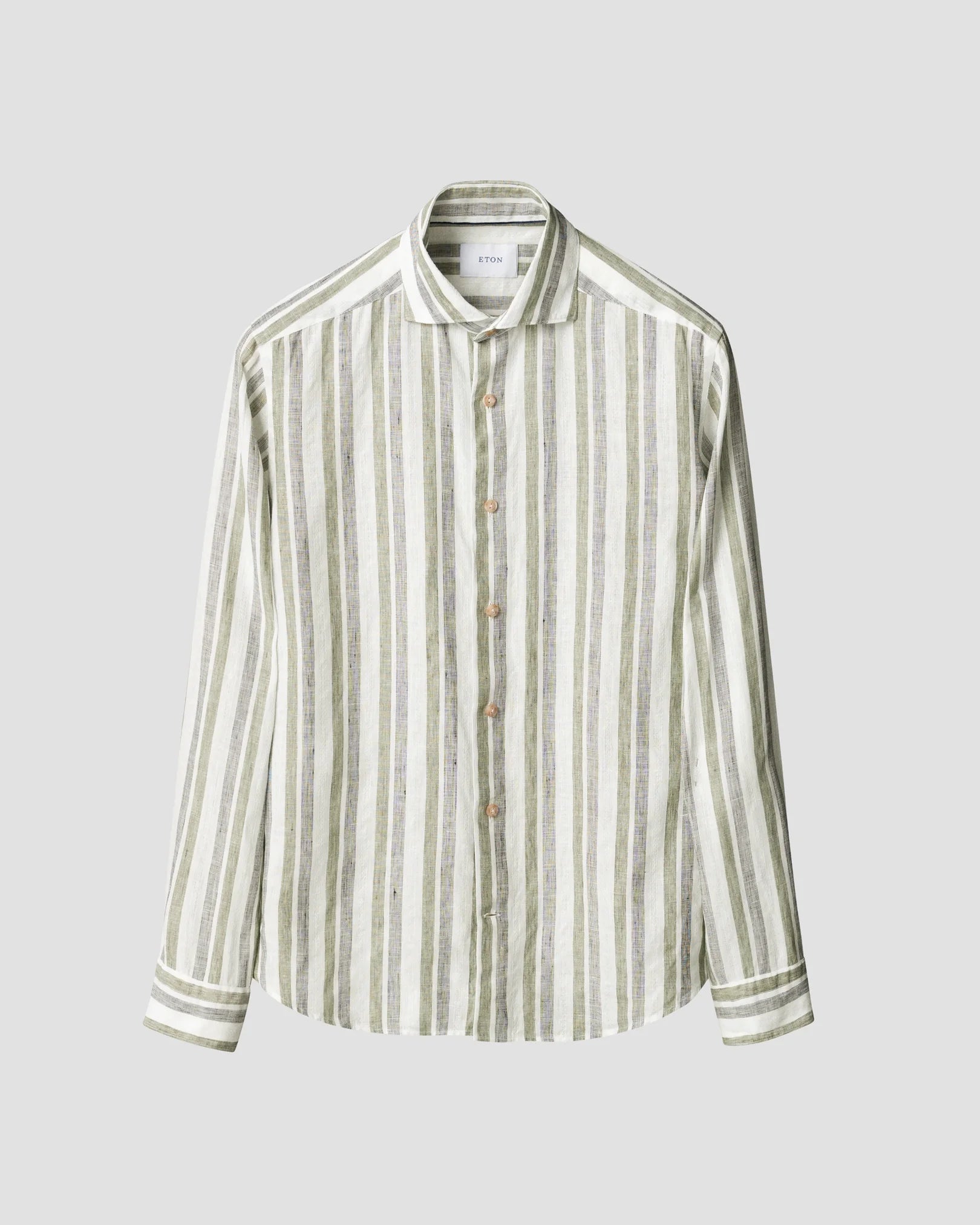 Crafted from 100% premium linen, this shirt is woven by the Italian mill Albini. The fabric features a unique reversed stripe pattern, woven with a combination of plain and dobby weaves, creating a distinct texture. Linen's natural moisture-wicking and thermo-regulating properties ensure breathability and comfort. Garment-washed for extra softness.
