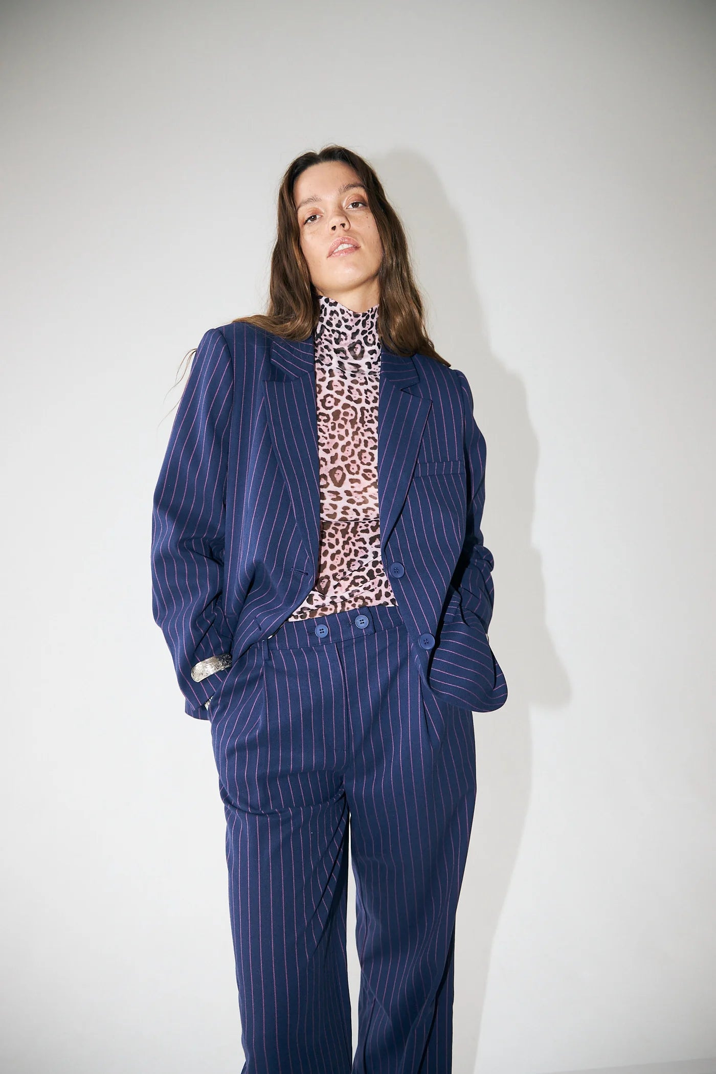 The TylerLL pants are a sophisticated choice that combine classic tailoring details with a modern twist. Designed in a deep navy base with slim pink pinstripes, the fit is comfortable with a straight leg. Style them with the AbbeyLL vest and the RyanLL blazer in the same fabric for a complete and elegant set.