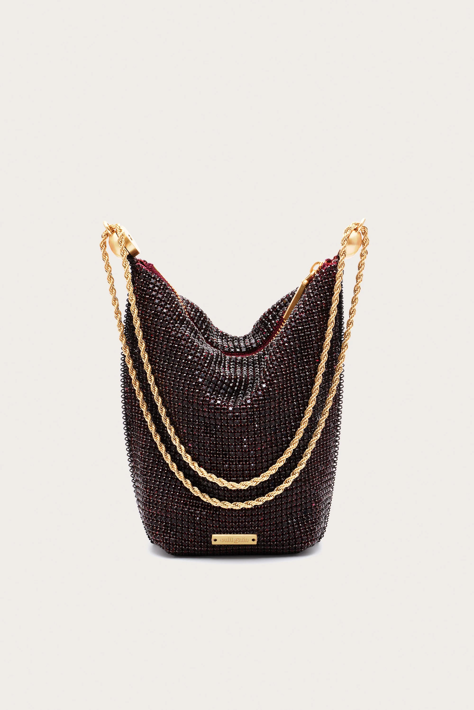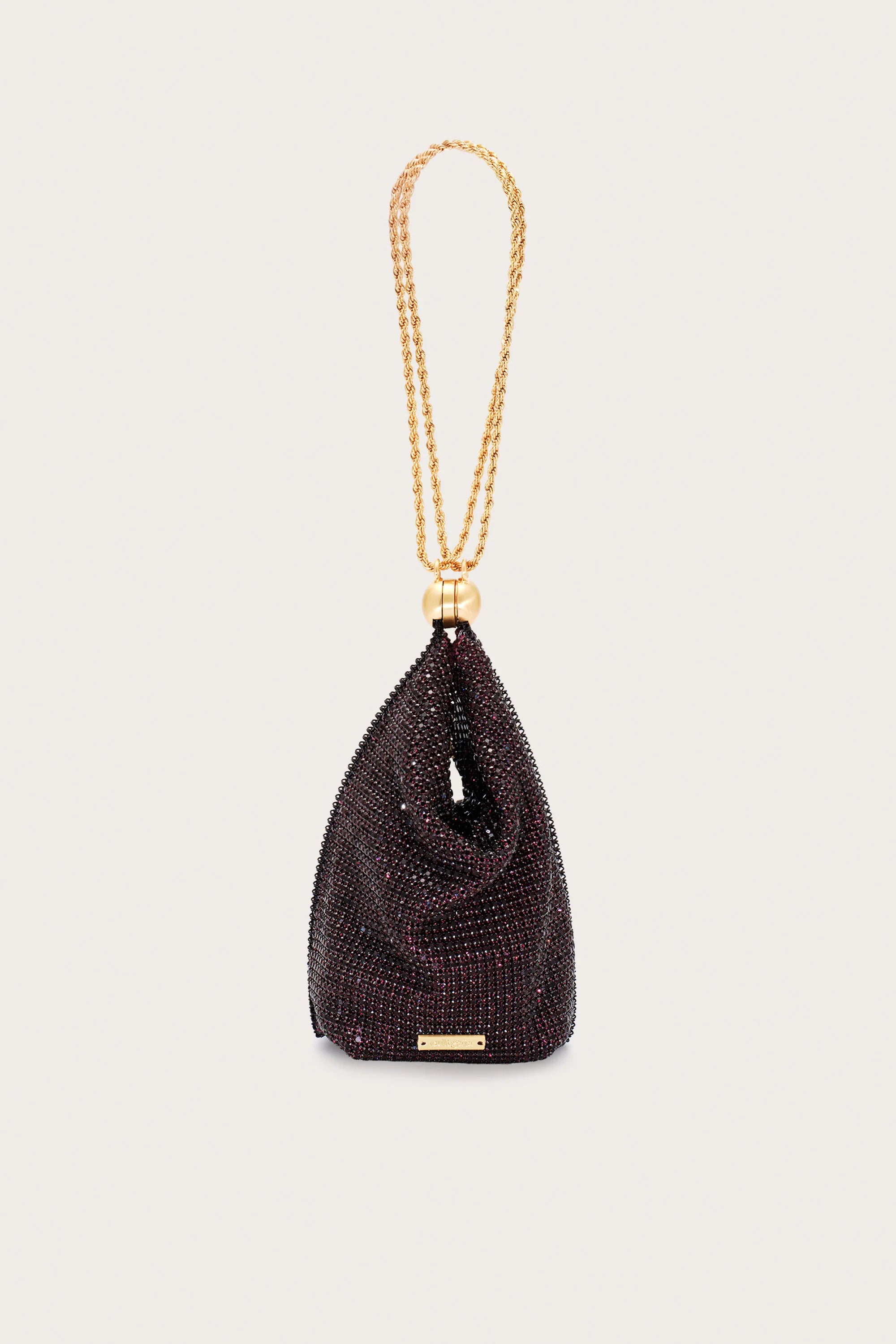 Rue is an elegant wristlet bag rendered in gold-toned trim and shimmering wine red glass beads.