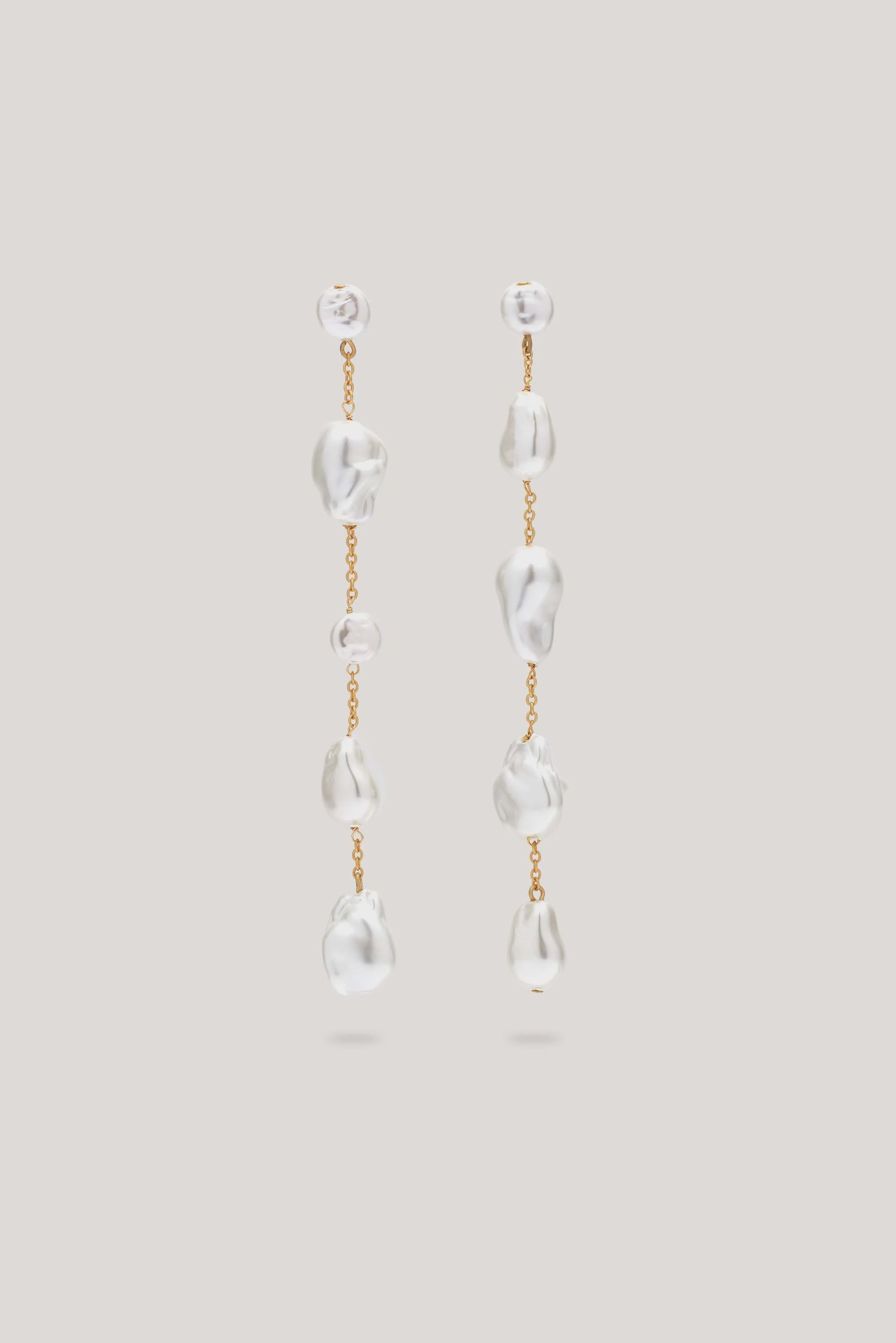 A delicate drop earring crafted out of irregularly shaped faux pearls.