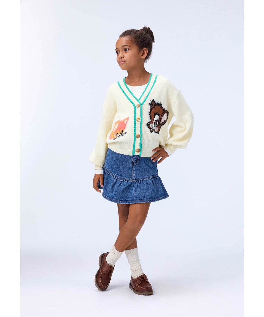 Blue denim skirt with a ruffle at the bottom. The skirt is knee-length and has both front and back pockets. It has a zip and snap button closure as well as belt loops. The waist has an internal adjustable elastic, so it can be adjusted for the right fit.This Molo product contains a minimum of 95% OCS-certified organically grown cotton.
