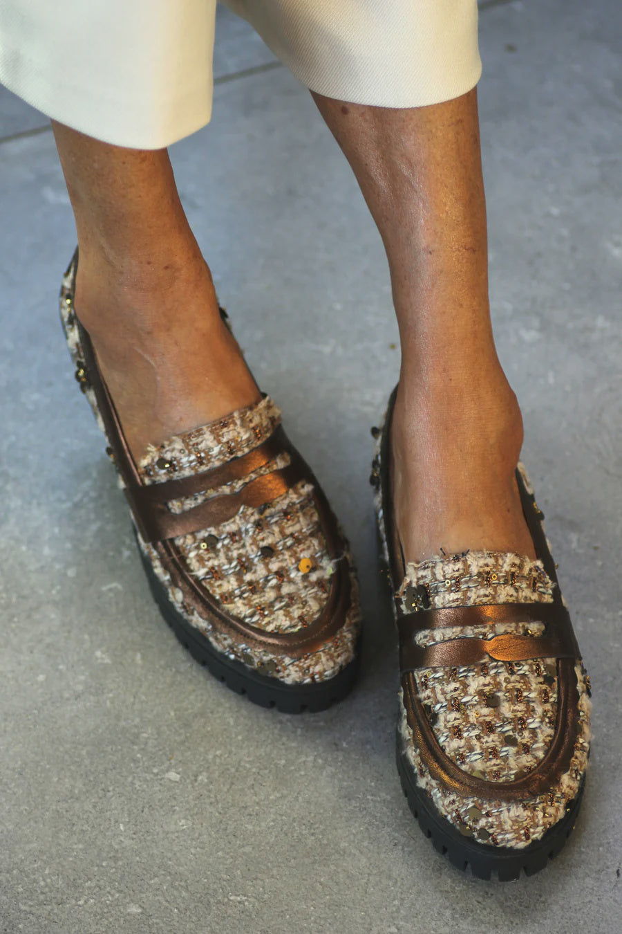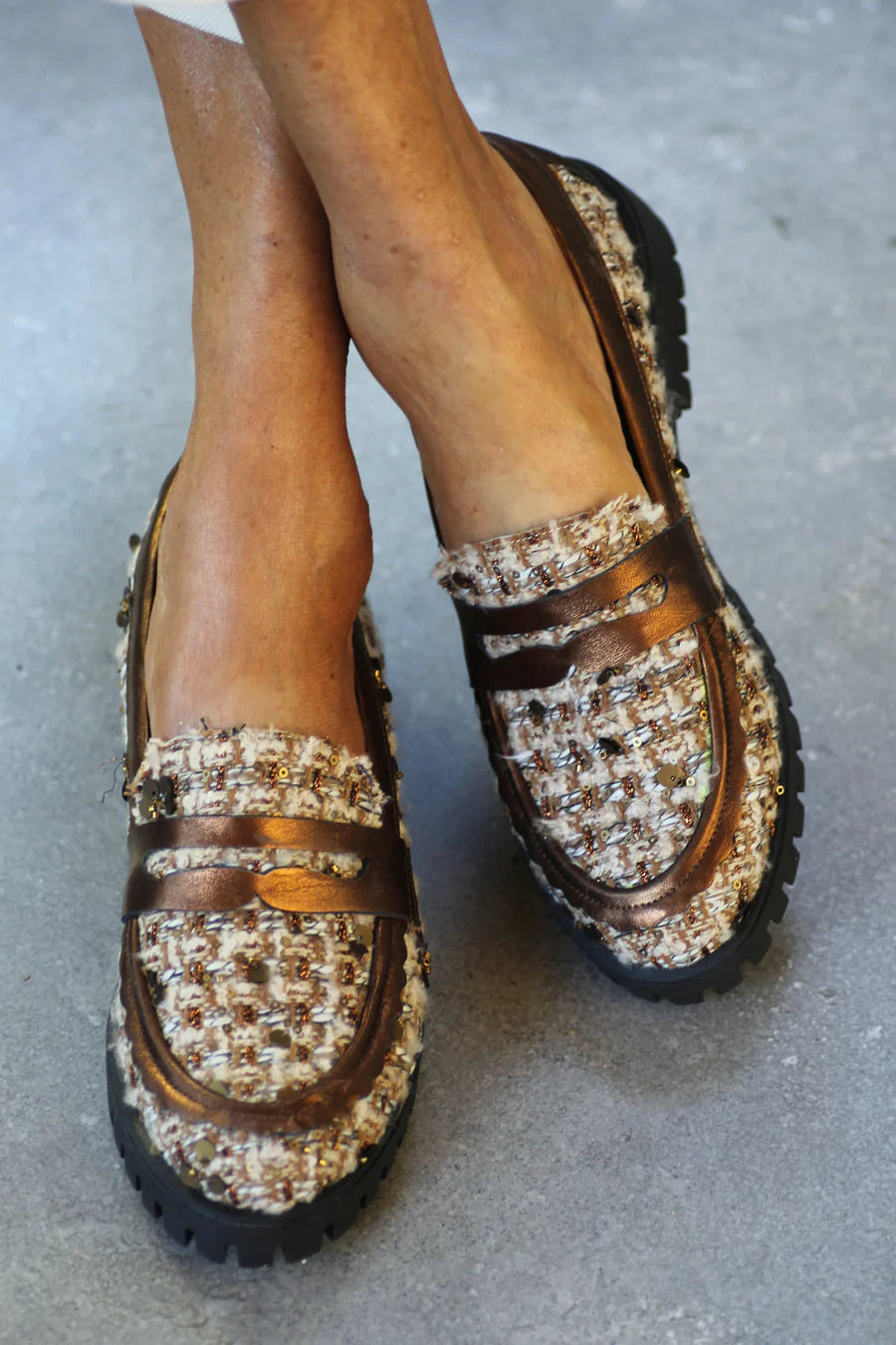 Wrapped in warm-toned tweed with a whisper of sequined sparkle, and finished with soft metallic leather in a rich, nutty bronze, the Toffee Nut loafers are as cozy as they are commanding. Perfect for autumn days when the air turns crisp and the city feels like a film set, they offer the ease of something you’ll actually want to walk in, without ever sacrificing polish. Wear them with tailored trousers and an oversized coat, or throw them on with denim and a turtleneck for that Diane Keaton–esque mix of timeless and disarmingly cool.Because really, why settle for boring shoes when these beauties exist?