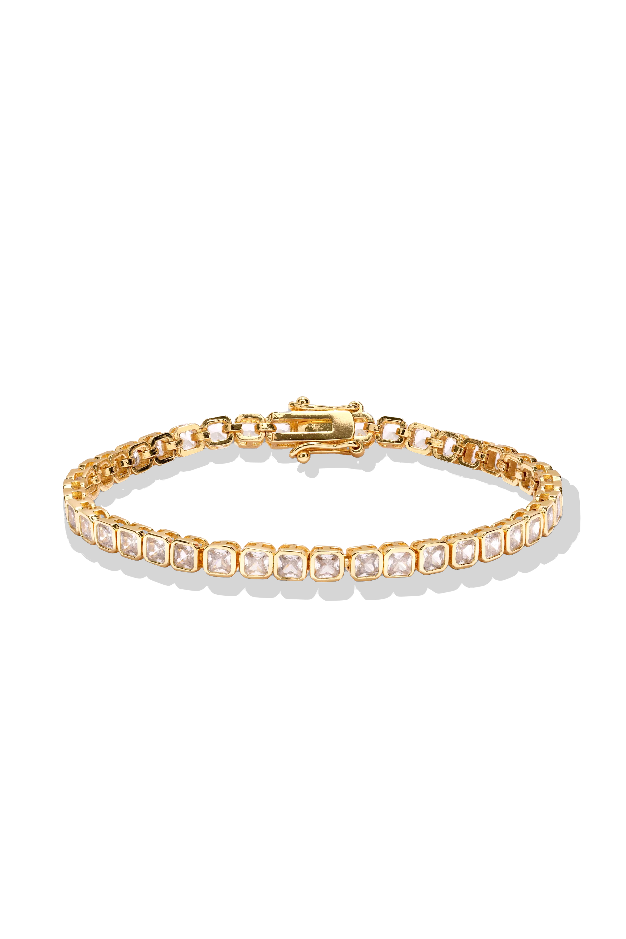 The Mini Elysian Bracelet offers a timeless elegance with a modern touch. Crafted from 18k gold-plated brass, it features a series of radiant square-cut cubic zirconias that catch the light beautifully. Perfect for elevating both everyday looks and special occasions, this classic-with-a-twist piece is your ultimate go-to for effortless sophistication.