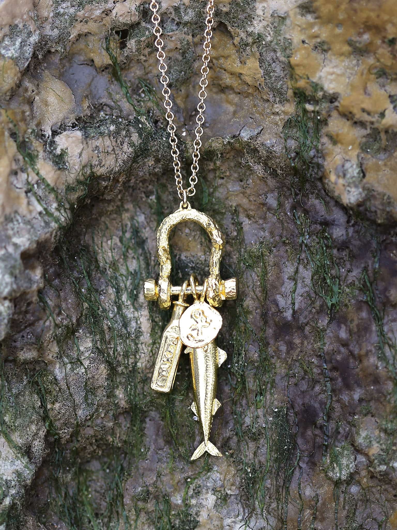 This playful necklace is inspired by exploring docklands and harbours when mudlarking on the shores. An array of charms hang from a textured chain link - a quirky fish, miniature poison bottle and a weathered anchor token. Handmade in our London workshop.