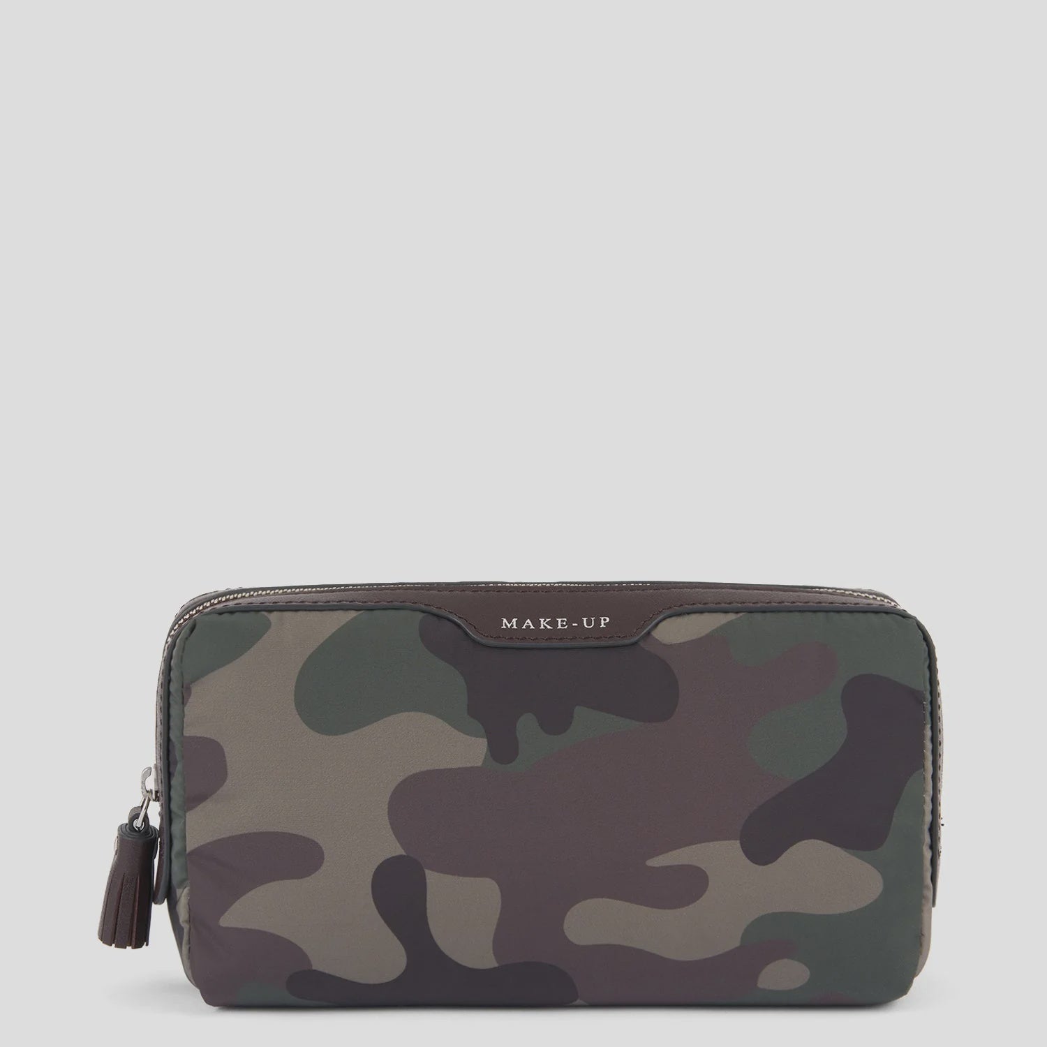 The Small Make-Up case is perfectly designed to house and transport your everyday must-haves. It's divided into two labelled, zipped compartments – one for make-up and another for brushes – to keep everything clean and easy to locate. Crafted from lightweight, padded, camo-print fabric, it’s lined with recycled nylon in an orange hue that calls to mind vintage bomber jackets, and comes finished with embossed leather labels and handmade tasselled zip pulls.