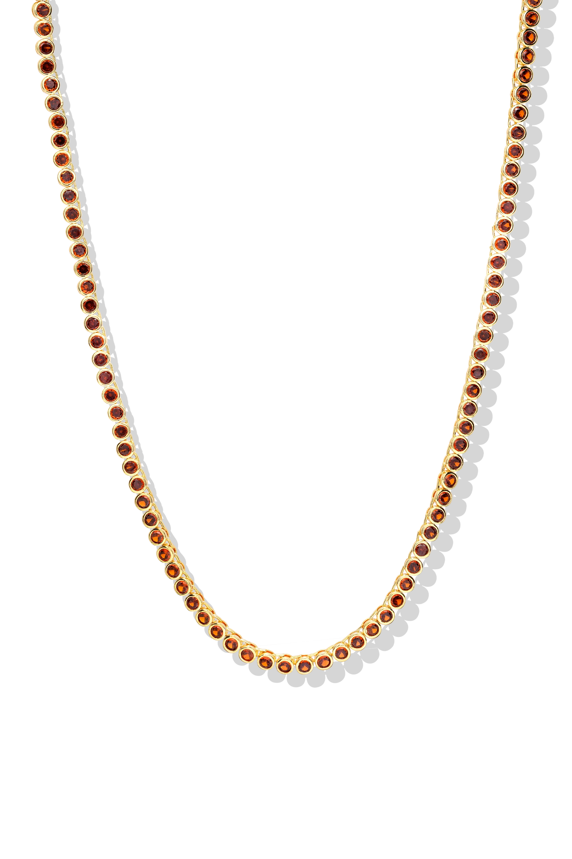 Elevate your everyday look with this timeless 18k gold-plated necklace in the beautiful color Amber. Featuring round cubic zirconia stones set in brass, this classic design is perfect for stacking or wearing solo, adding a touch of elegance to any outfit.
