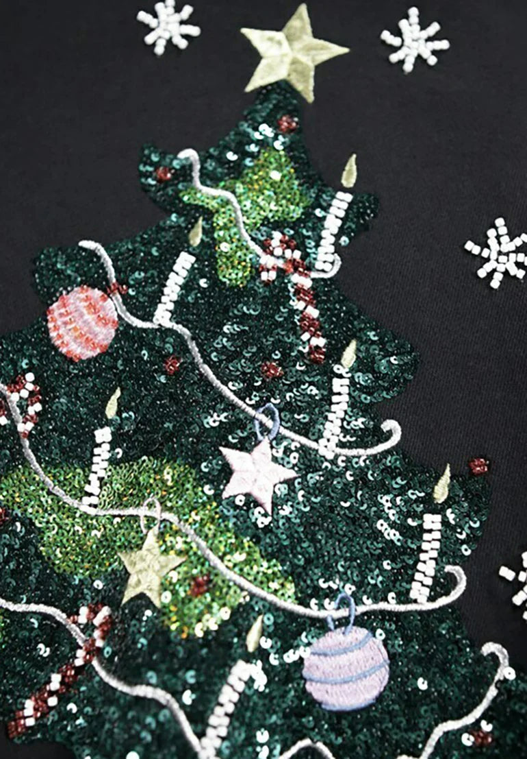 Molo's black Marge sweatshirt with a sequined Christmas tree. This Marge sweatshirt, with its minimalist yet whimsical design, can easily be worn with jeans, jogging pants, a skirt or Molo leggings to create a multitude of outfits!